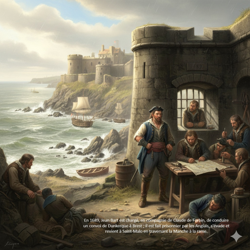 En compagnie de Claude de Fortin, (officier de marine, chevalier et comte de Gardanne), Jean Bart, corsaire Royal, qui cumule les succès sur les flottes ennemies, a pour mission d’escorter un convoi de Dunkerque à Brest. Jean et claude sont capturés et faits prisonniers des Anglais, et emprisonnés à Plymouth, malgré leurs blessures, s’échappent après deux jours, grâce à l’aide de deux matelots, Goguet – Jean Suidre, du chirurgien Jean Lefebvre et d’un autre matelot jean Quenette. Se faisant passer pour des pécheurs anglais devant les garde-côtes, il rentre à la rame en France, avec Claude et deux matelots. Il est nommé capitaine de Vaisseau par Louis XIV, et épouse en deuxième noce, Jacqueline Tugghe, le 13 octobre 1689, avec laquelle il aura 10 enfants.